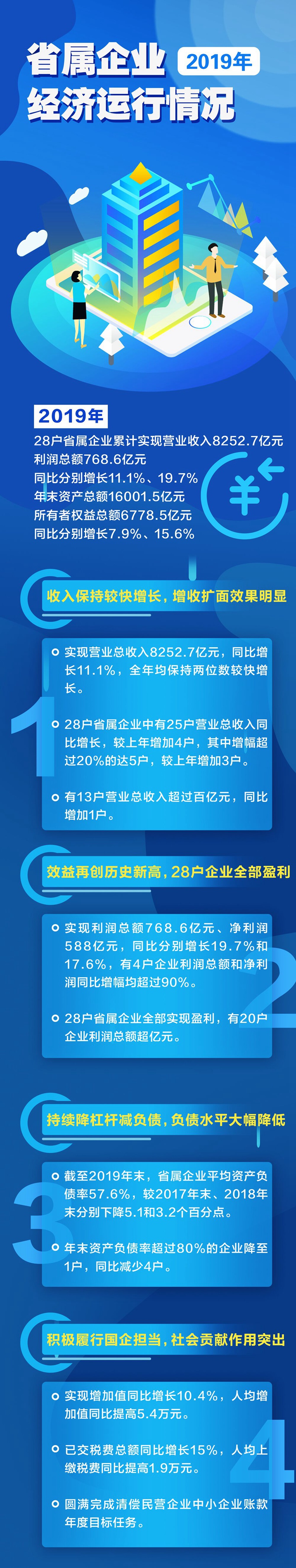 2019年,28户48365大写_365wm完美体育官网_sport365企业累计实现营业收入8252.7亿元、利润总额768.6亿元,同比分别增长11.1%、19.7%。年末资产总额16001.5亿元、所有者权益总额6778.5亿元,同比分别增长7.9%、15.6%。