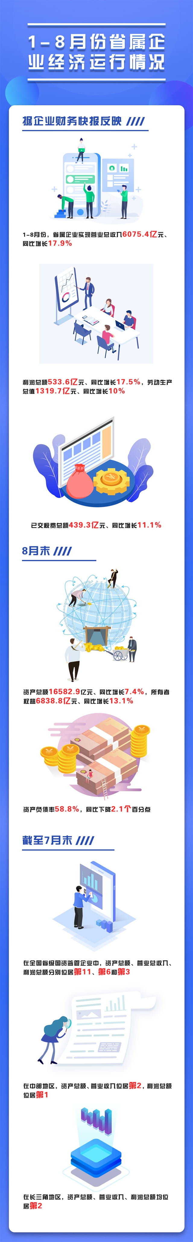 据企业财务快报反映,1-8月份,48365大写_365wm完美体育官网_sport365企业实现营业总收入6075.4亿元、同比增长17.9%,利润总额533.6亿元、同比增长17.5%,劳动生产总值1319.7亿元、同比增长10%,已交税费总额439.3亿元、同比增长11.1%。8月末资产总额16582.9亿元、同比增长7.4%,所有者权益6838.8亿元、同比增长13.1%,资产负债率58.8%,同比下降2.1个百分点。截至7月末,在全国省级国资监管企业中,资产总额、营业总收入、利润总额分别位居第11、第6和第3;在中部地区,资产总额、营业收入位居第2,利润总额位居第1;在长三角地区,资产总额、营业收入、利润总额均位居第2。