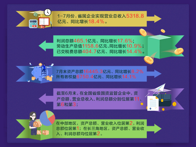据企业财务快报反映,1-7月份,48365大写_365wm完美体育官网_sport365企业实现营业总收入5318.8亿元、同比增长18.4%,利润总额465.1亿元、同比增长17.6%,劳动生产总值1158.6亿元、同比增长10.9%,已交税费总额404.7亿元、同比增长14.4%。7月末资产总额16445.3亿元、同比增长8.2%,所有者权益6750.4亿元、同比增长14.1%。截至6月末,在全国省级国资监管企业中,资产总额、营业总收入、利润总额分别位居第11、第6和第3;在中部地区,资产总额、营业收入位居第2,利润总额位居第1;在长三角地区,资产总额、营业收入、利润总额均位居第2。